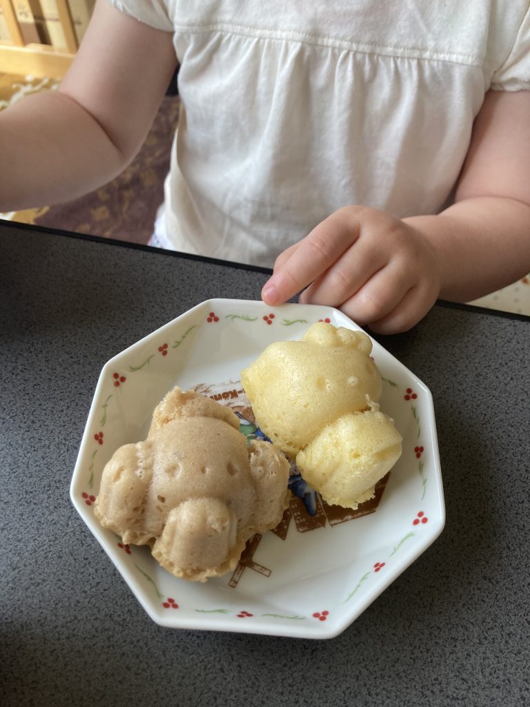 ほんのり色が違うのは、ココアを入れてみたからです。おいしい~!と喜んで、リンゴジュースで乾杯しながらおやつタイムを楽しみました。
