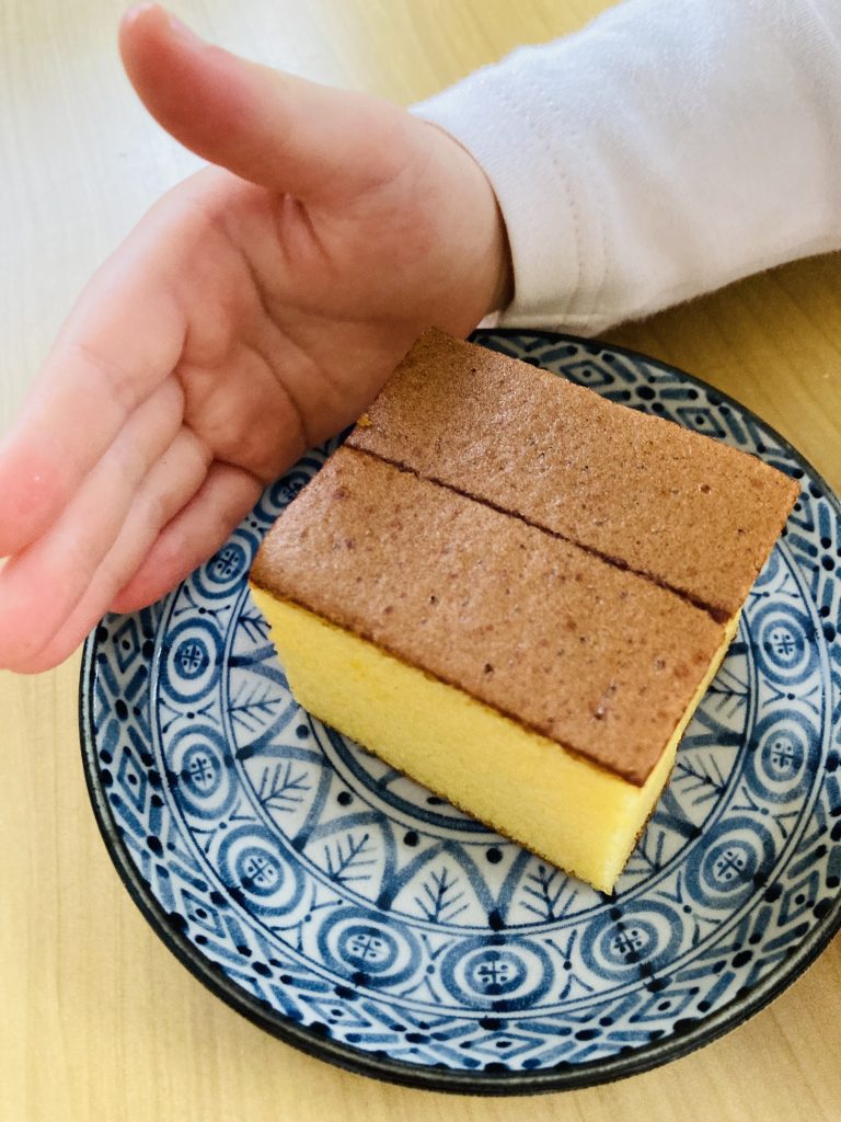 中身は小さめのカステラが2切れ入っていましたが、香りが良く頬張っていました。