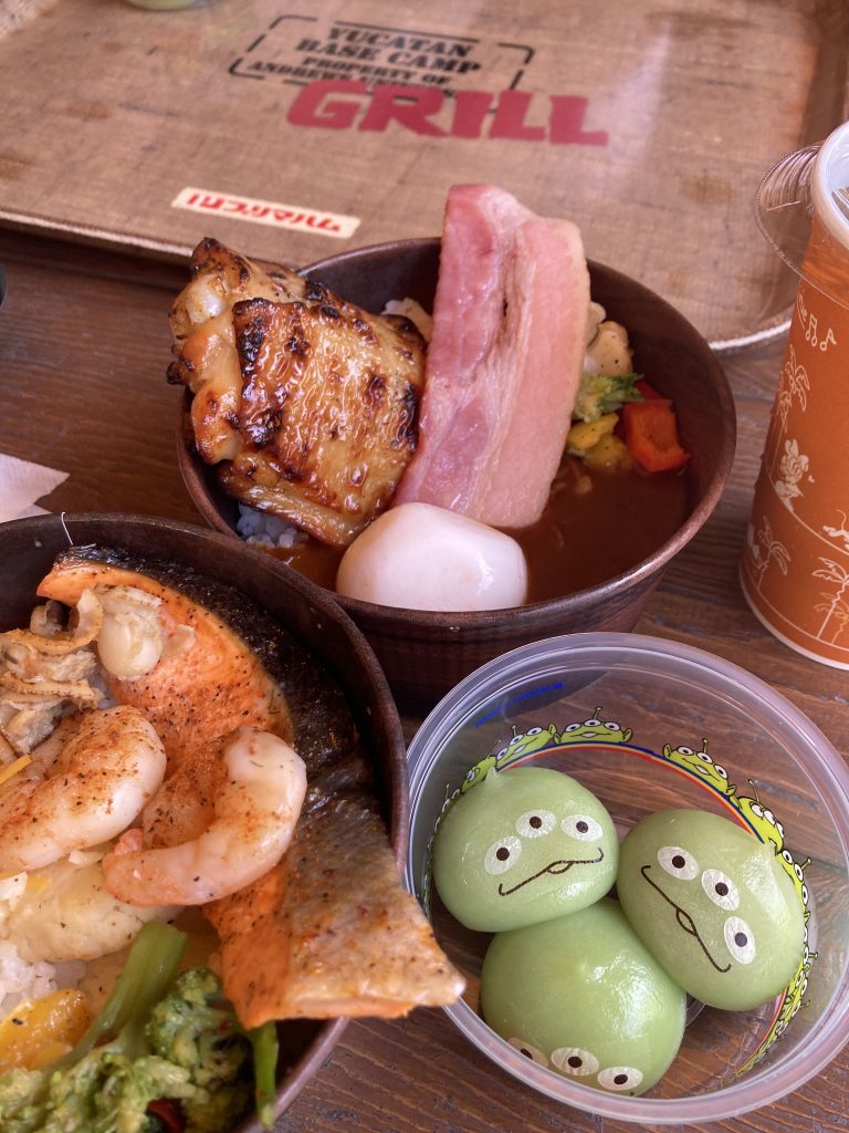 お昼は涼しい室内が空いてなくて、外の席に行きましたが、室内との扉のすぐ横だったので冷房がサーっと来て涼しく食べられました。夏のDisneyは気を付けないと熱中症になりやすいですね。こまめに休憩を取るのと、冷凍の飲み物を持参したのが良かったです。